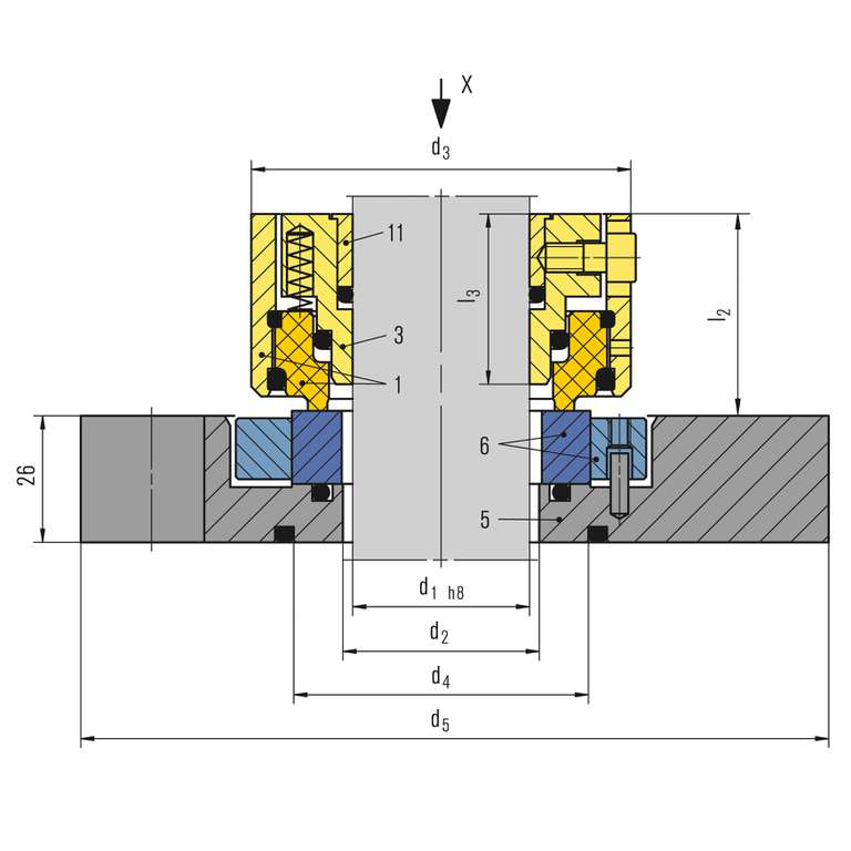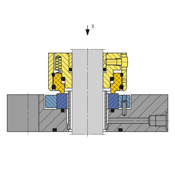 The SeccoMix 1-11 is equipped in addition with a sleeve for trapping any abraded particles from the seal face. Contamination of the medium in the container is thus ruled out. The sleeve can be cleaned through a flushing bore.