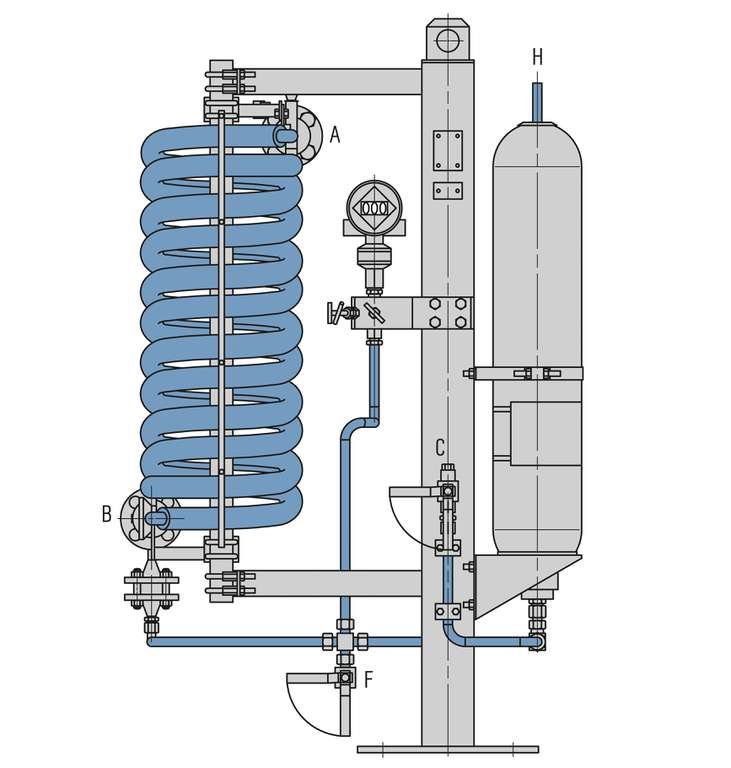 Pressurization (> process pressure) prevents the process medium from getting into the barrier circuit or the atmosphere. Pressurization is supplied by a pressure accumulator which is pre-loaded with nitrogen. Circulation in the barrier circuit takes place by the thermosiphon principle or by forced circulation, e.g. with a pumping screw.