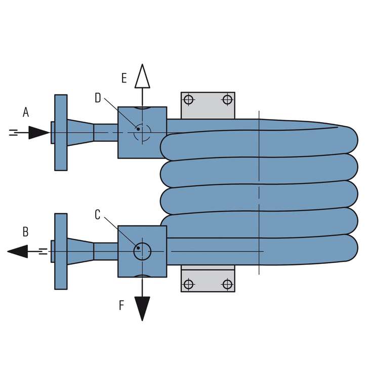 WDK5120 heat exchangers are used to cool process/barrier fluids in seal supply circuits. The heat exchanger has a wound double helix around the guide tube. Process/barrier medium in the tubes, cooling medium around the tubes.